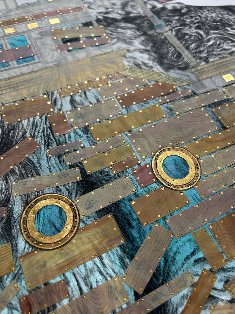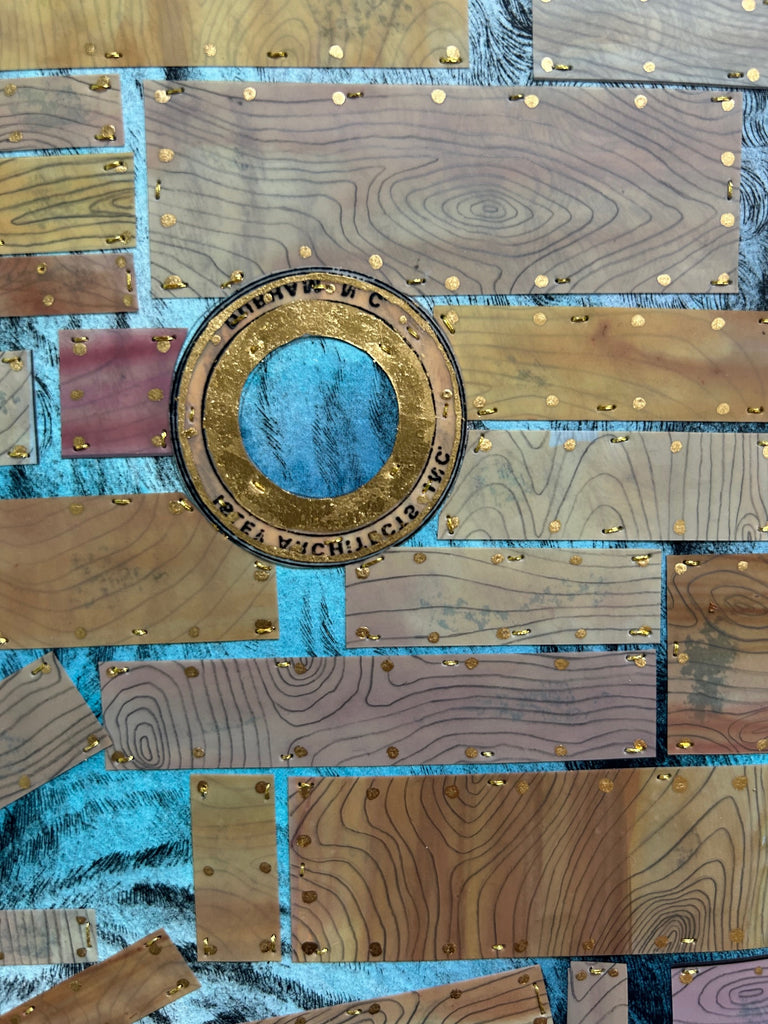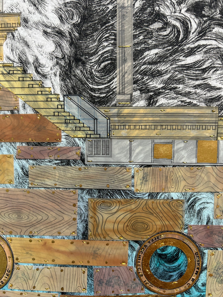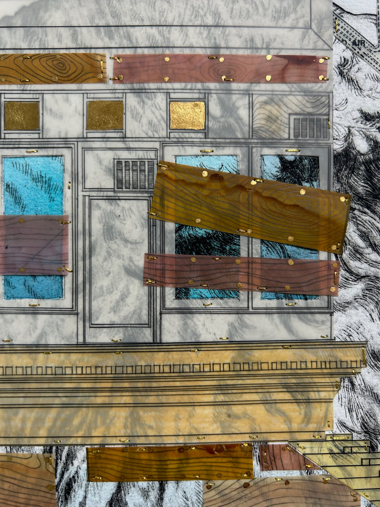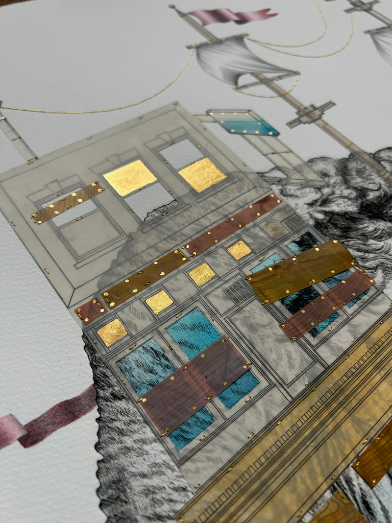 Original Intaglio Etching, hand stitching, pencil drawing, vintage architectural drawings, painted vellum, gold leaf, and hand painted. The piece is framed under UV protected glass in a solid white wood frame (36" x 46" in frame). Shipping included, shipping only available within the continental United States. Due to the large size of this piece, it will be shipped with a white glove art shipping service and can take up to 6 weeks lead time.