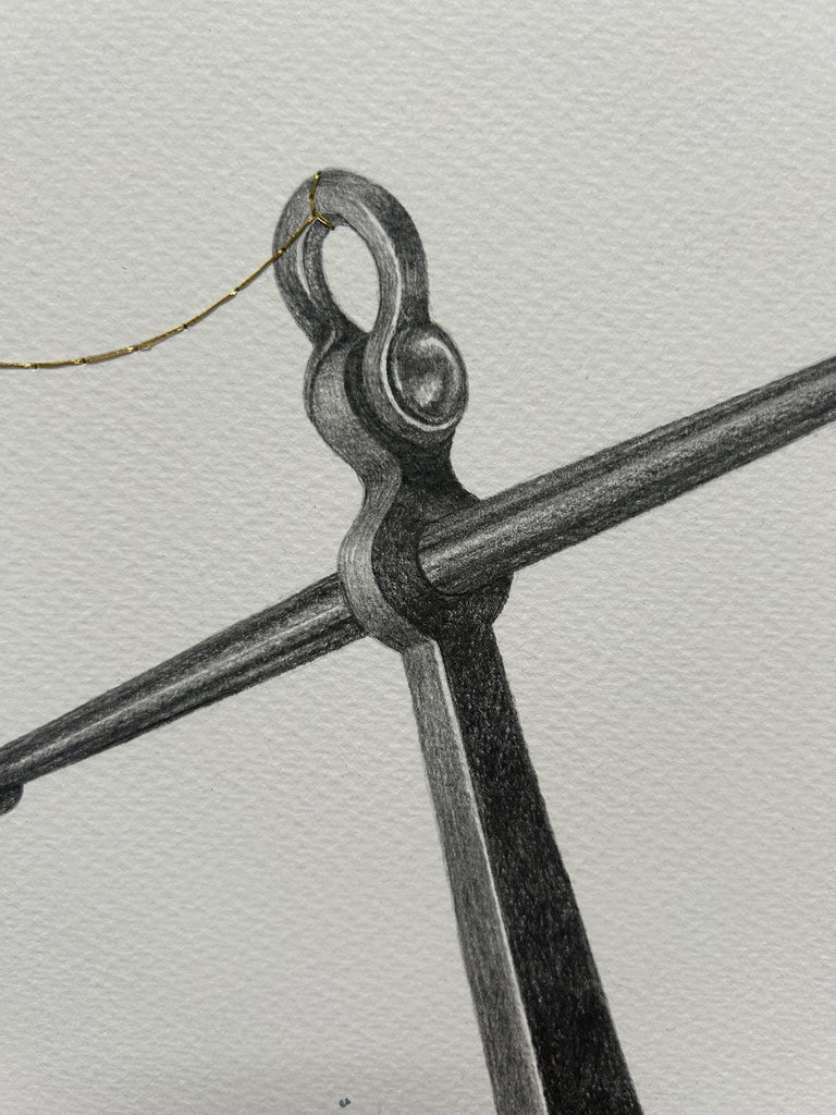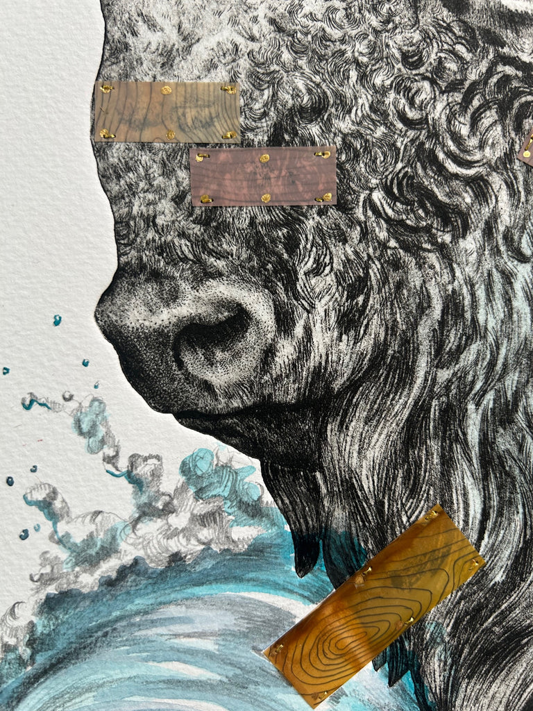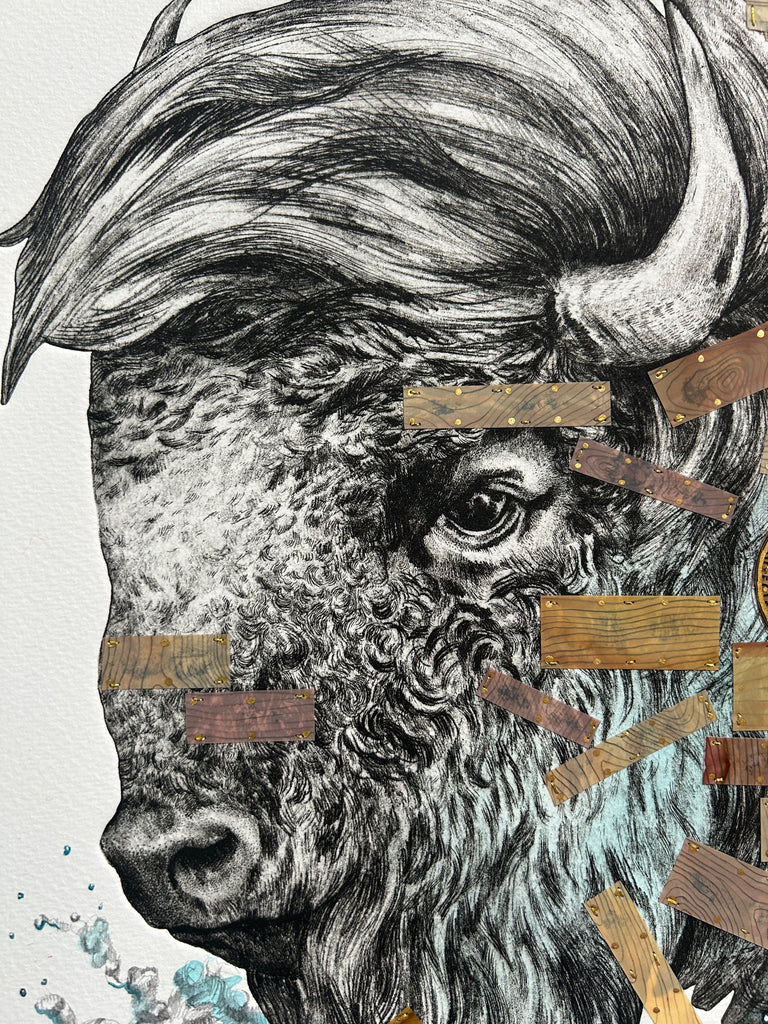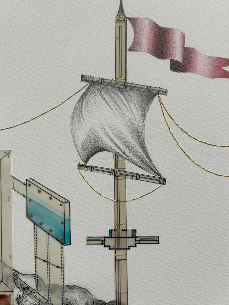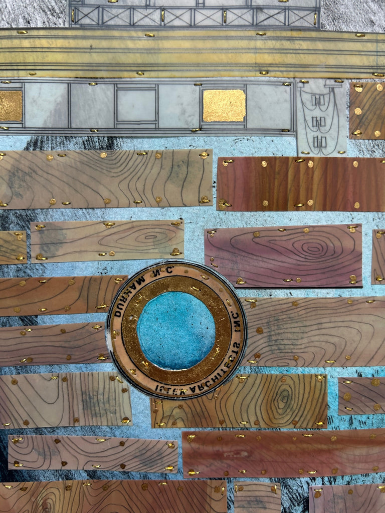 Original Intaglio Etching, hand stitching, pencil drawing, vintage architectural drawings, painted vellum, gold leaf, and hand painted. The piece is framed under UV protected glass in a solid white wood frame (36" x 46" in frame). Shipping included, shipping only available within the continental United States. Due to the large size of this piece, it will be shipped with a white glove art shipping service and can take up to 6 weeks lead time.