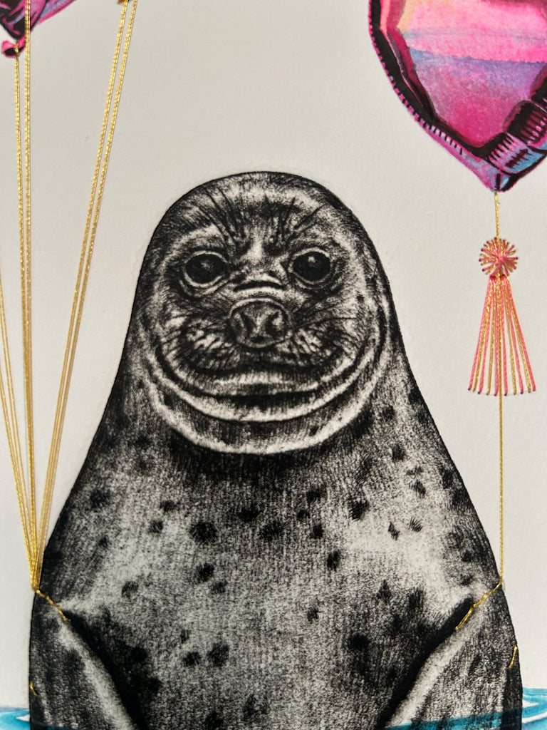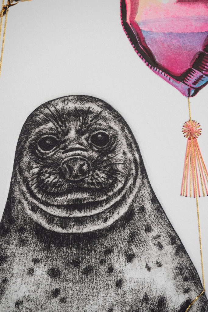 Original Intaglio Etching, hand stitching, gold leaf, and hand painted. 10" x 20" framed under UV protected glass in a solid white wood frame (11"x21" in frame). Shipping included, shipping only available within the continental United States.