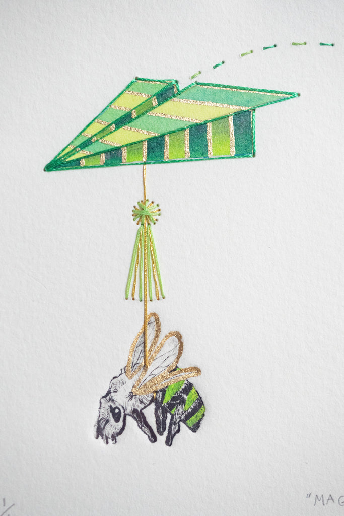 Original Intaglio Etching, hand stitching, gold leaf, and hand painted. 5"x7" artwork in 8" x 10" mat framed under UV protected glass in a solid white wood frame (9"x11" in frame). Shipping included, shipping only available within the continental United States.