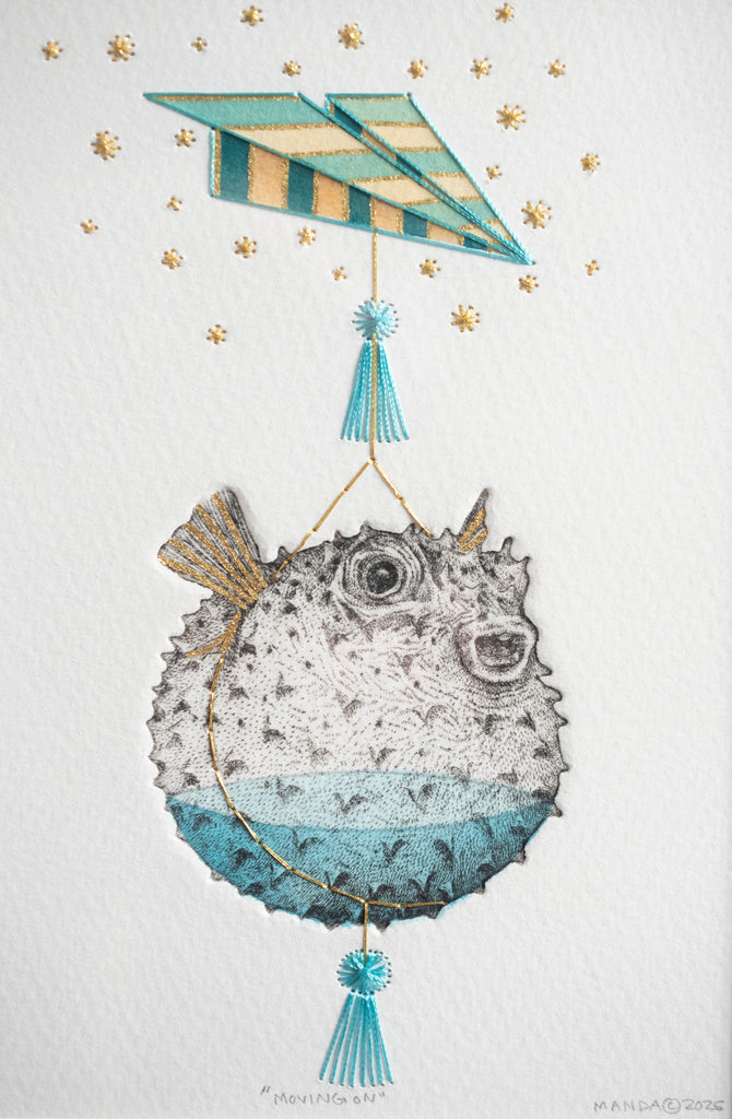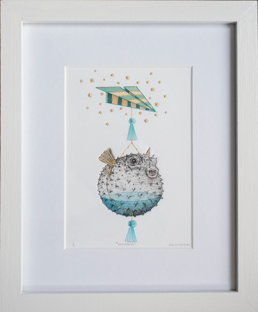 Original Intaglio Etching, hand stitching, gold leaf, and hand painted. 5"x7" artwork in 8" x 10" mat framed under UV protected glass in a solid white wood frame (9"x11 "in frame). Shipping included, shipping only available within the continental United States.