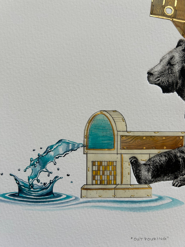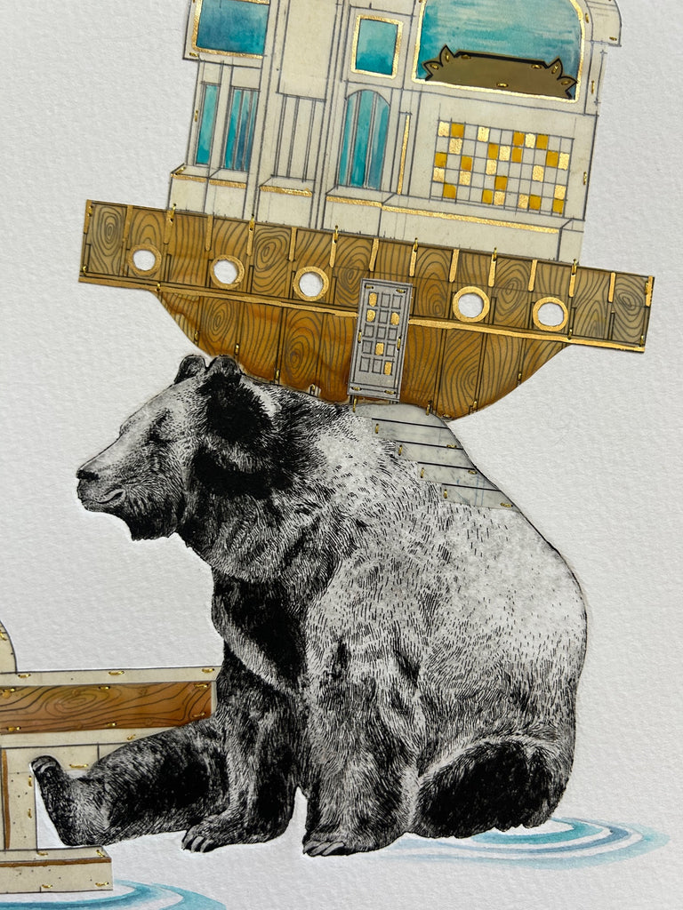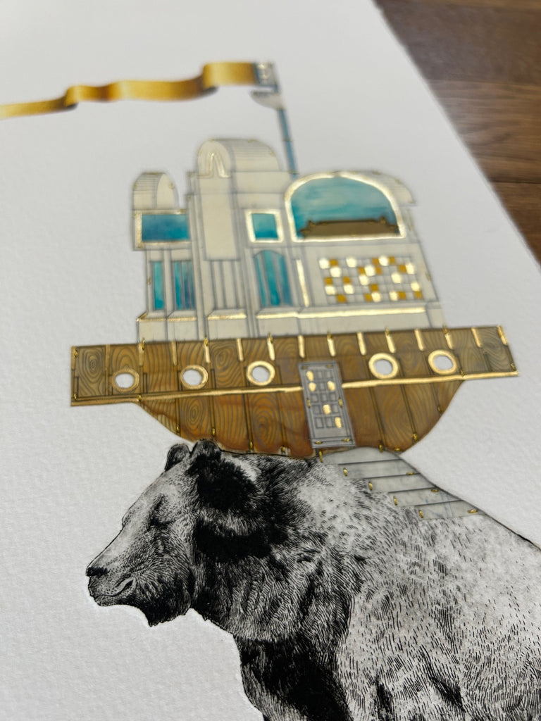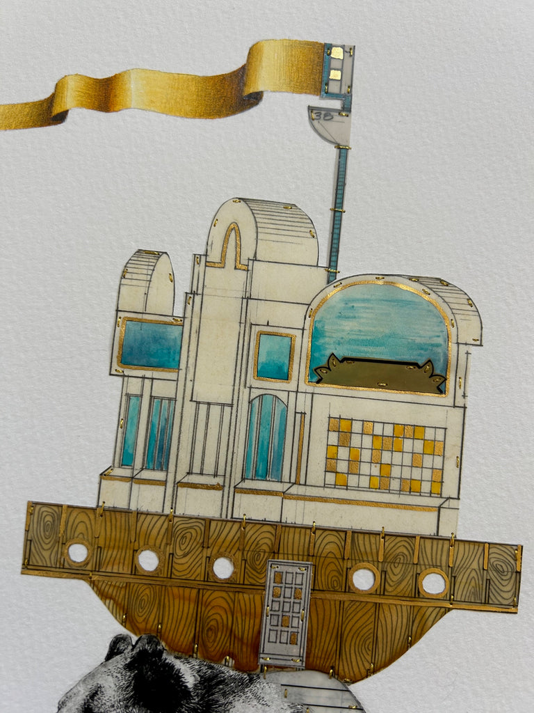 Original Intaglio Etching, hand stitching, vintage architectural drawings, pencil drawing, gold leaf, and hand painted. 11" x 14" framed under UV protected glass in a solid white wood frame (12x15 in frame). Shipping included, shipping only available within the continental United States.
