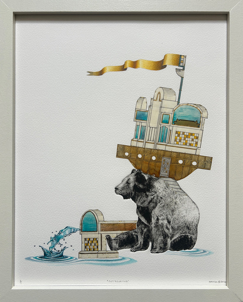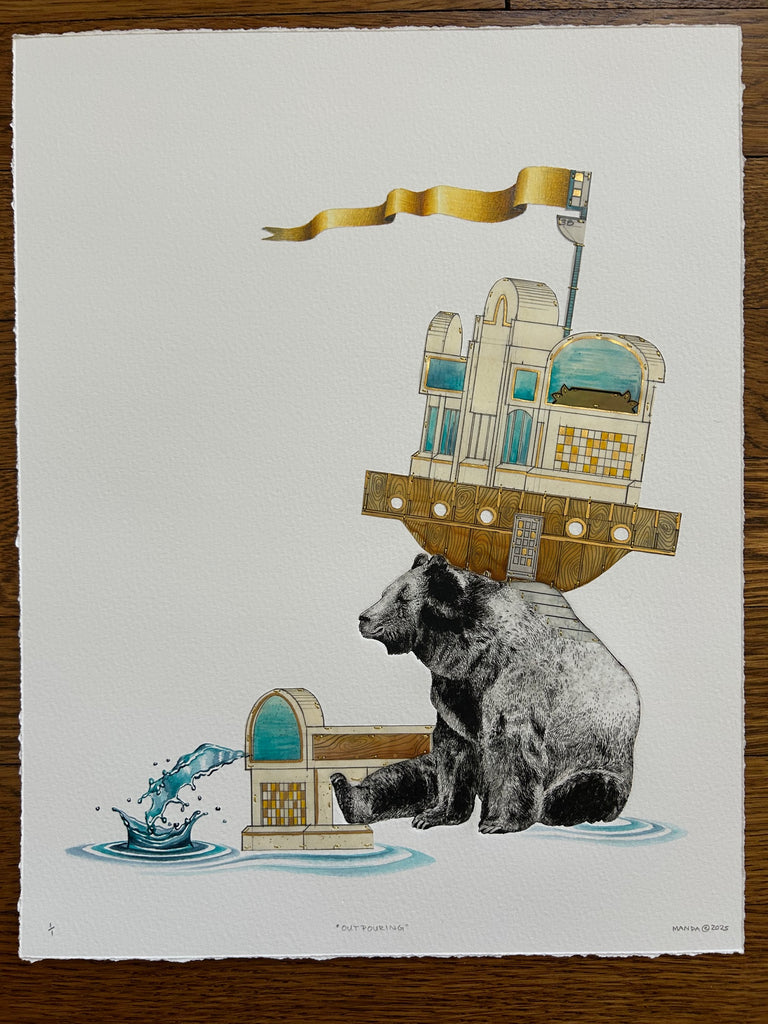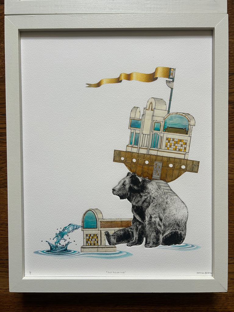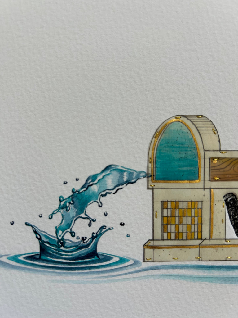 Original Intaglio Etching, hand stitching, vintage architectural drawings, pencil drawing, gold leaf, and hand painted. 11" x 14" framed under UV protected glass in a solid white wood frame (12x15 in frame). Shipping included, shipping only available within the continental United States.